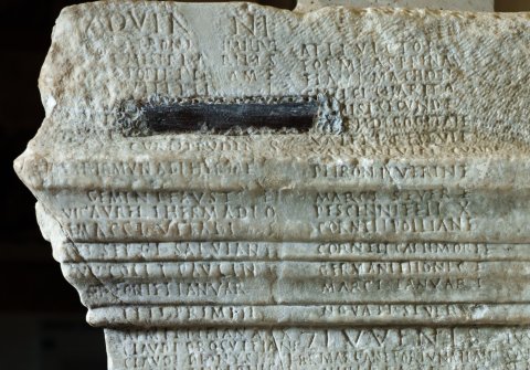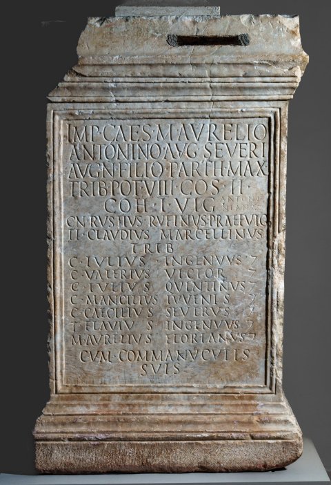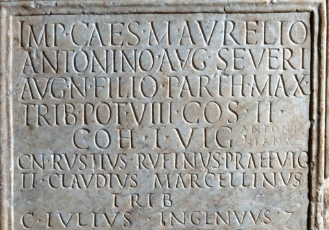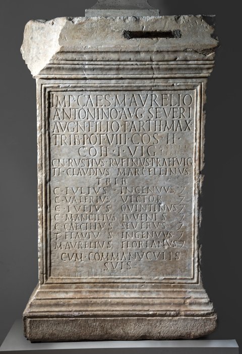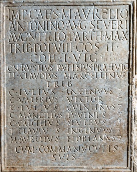 Imp(eratori) Caes(ari) M(arco) Aurelio / Antonino Aug(usto) Severi / Aug(usti) n(ostri) filio Parth(ico) max(imo) / trib(unicia) pot(estate) VIII co(n)s(uli) II / coh(ors) I vig(ilum) Antoni/niana / Cn(aeus) Rustius Rufinus praef(ectus) vig(ilum) / Ti(berius) Claudius Marcellinus / trib(unus) / C(aius) Iulius Ingenuus |(centurio) / C(aius) Valerius Victor |(centurio) / C(aius) Iulius Quintinus |(centurio) / C(aius) Mancilius Iuvenis |(centurio) / C(aius) Caecilius Severus |(centurio) / T(itus) Flavius Ingenuus |(centurio) / M(arcus) Aurelius Florianus |(centurio) / cum comman<ip=VC>ulis / suis //