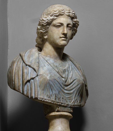 - Bruch durch den Halsansatz, Nase u. Büste ergänzt
