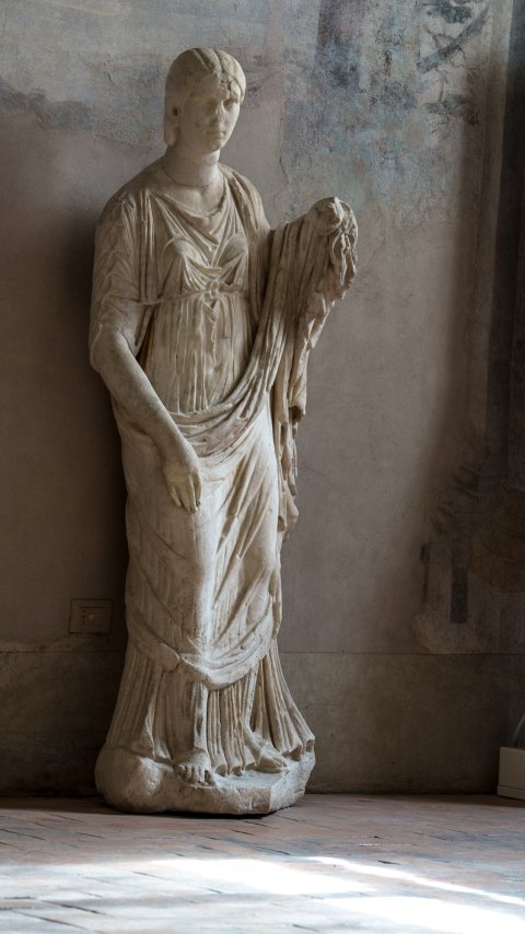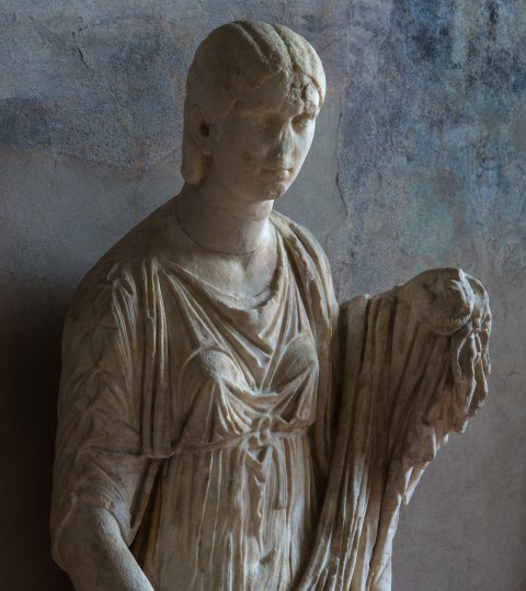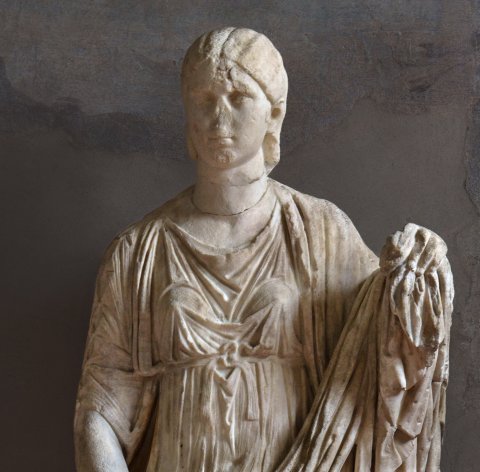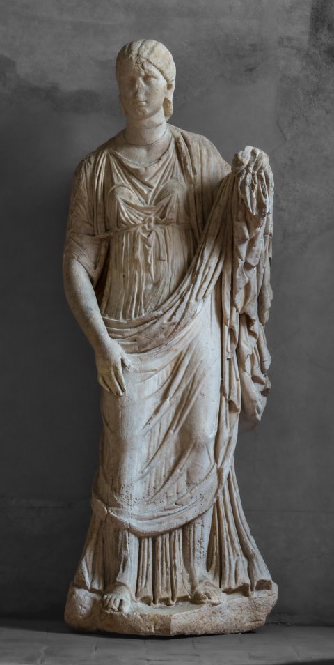- Stehende Frau in hochgegürtetem Ärmelchiton und Mantel. Porträtkopf mit Scheitelzopffrisur.