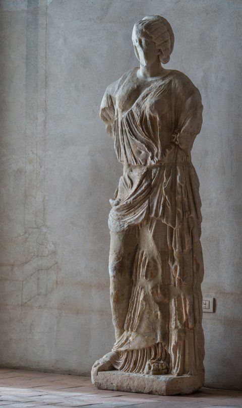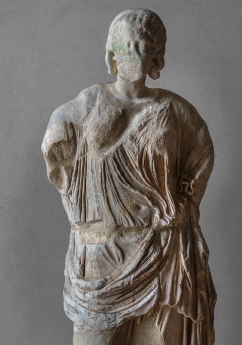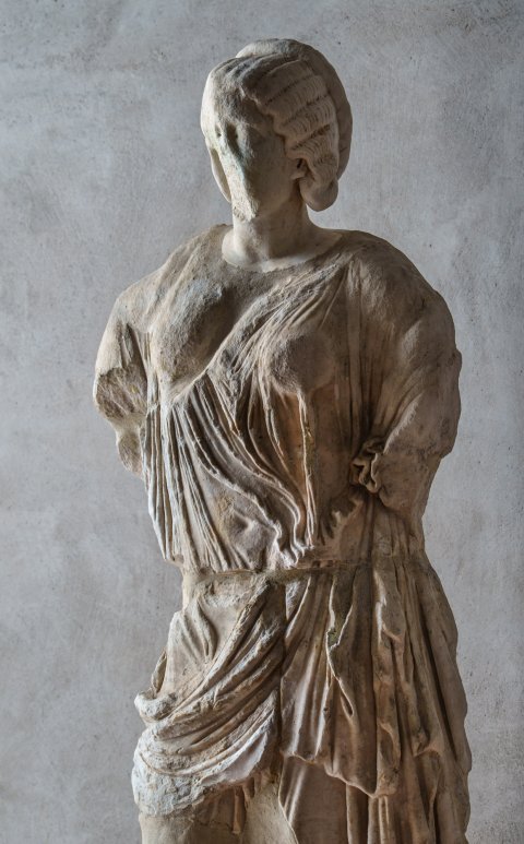 - Stehende Frau in Chiton und Mantel, Porträtkopf mit Scheitelzopffrisur.