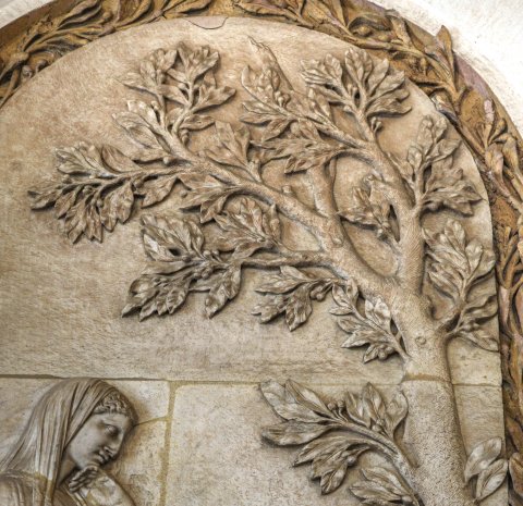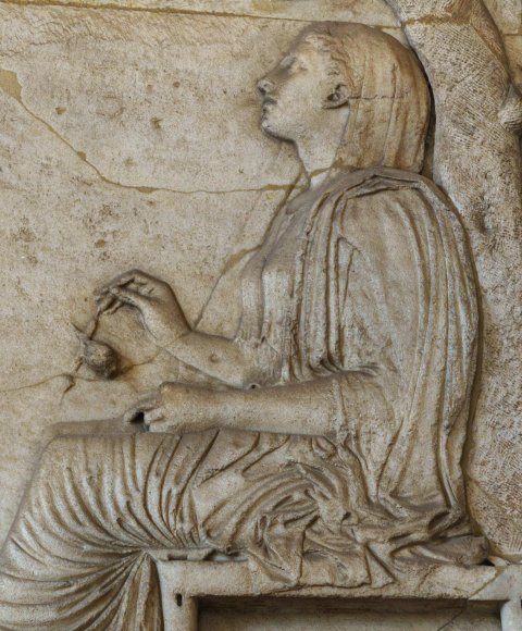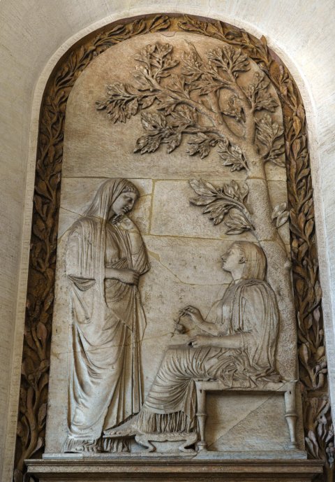 - aus Fragmenten zusammengesetzt, ergänzt sind: der ganze obere Teil der Stele samt Kopf u. linker Hand der stehenden Figur, der Lorbeerbaum, die rechte untere Ecke mit dem rechten Stuhlbein und ein Stück der Bodenleiste