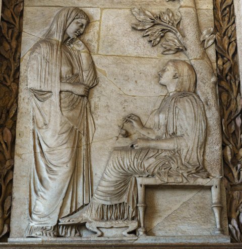 - Auf einem lehnenlosen Stuhl mit Fußschemel sitzende Frau mit über den Kopf gezogenem Mantel, in der rechten Hand Spindel. Vor ihr stehende Frau in Trauerhaltung.