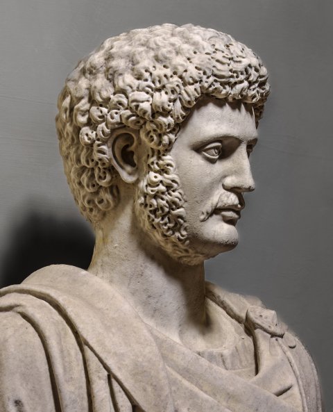 - Porträtbüste eines Mannes mit das Kinn freilassendem Backenbart und dicht gelocktem Haar. Mantel mit runder Fibel auf der linken Schulter.