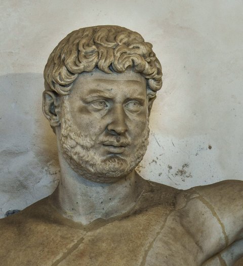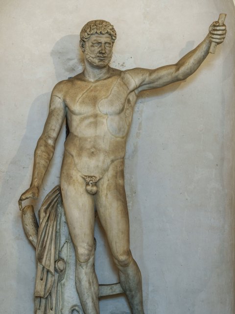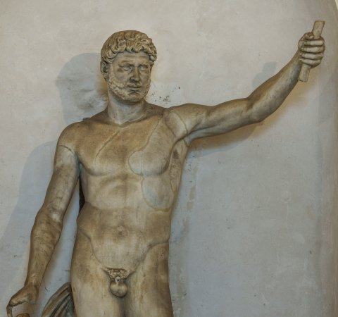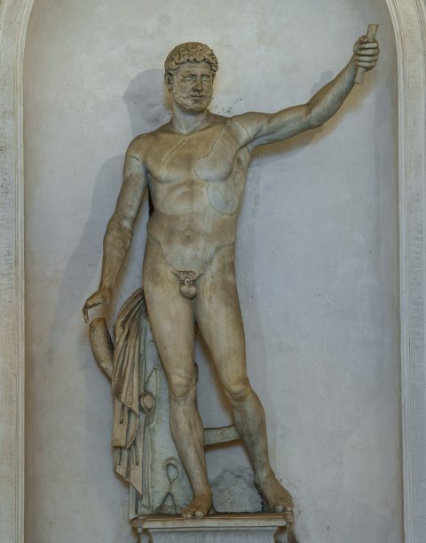- Stehende nackte Statue eines Mannes mit erhobenem linken Arm, Stütze mit Mantel, dahinter Rundschild. Kopf ist neuzeitliche Nachbildung eines Hadrian-Porträts.