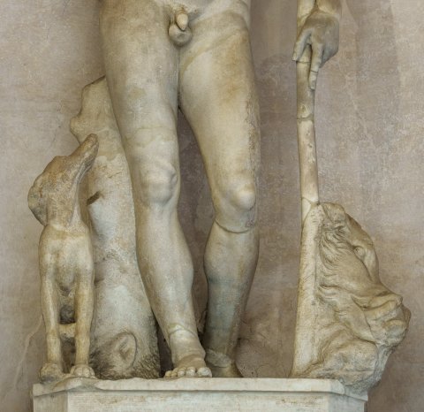 - Mythische Figur: Meleager mit auf den Rücken gelegter rechter Hand, in der Linken Stab, neben dem rechten Bein Baumstammstütze und Hund, neben dem linken Fuß Eberkopf.