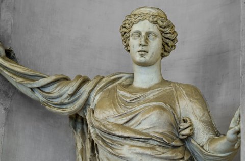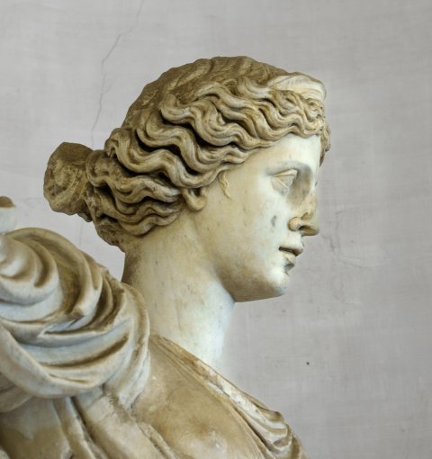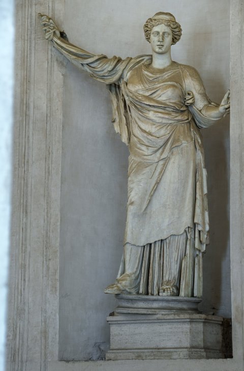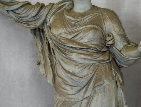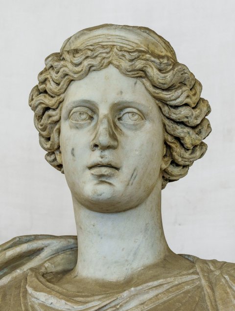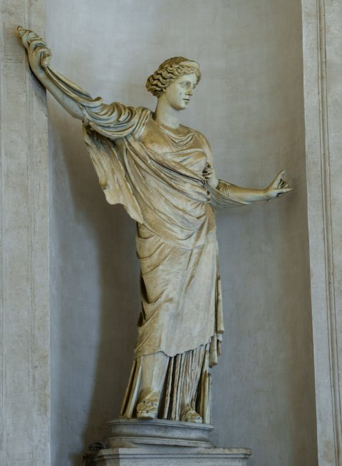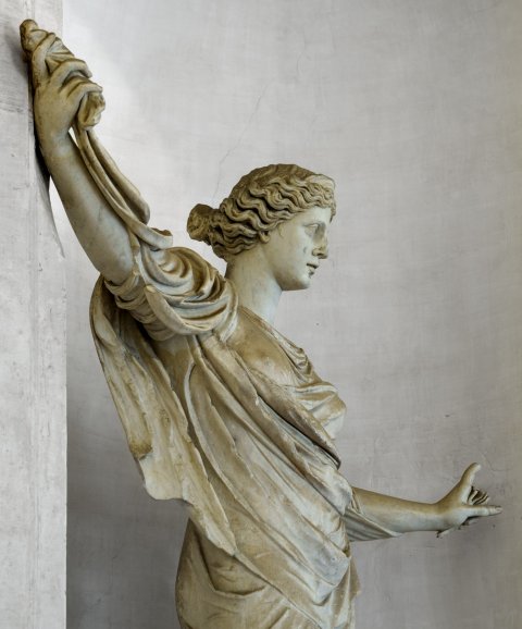 - Stehende Göttin in Chiton und Mantel, rechter Arm war erhoben; idealtypischer Kopf mit Nackenknoten und Diadem.