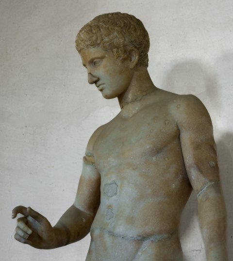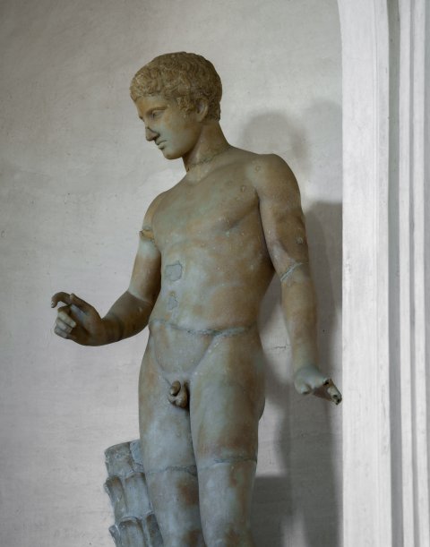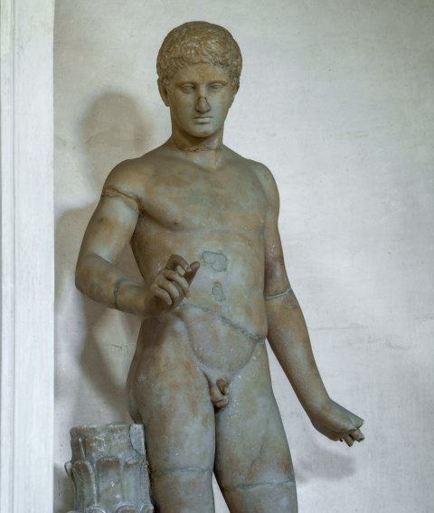 - Stehender nackter Jüngling, Palmstammstütze, runde Plinthe mit profiliertem Rand.