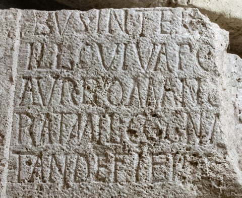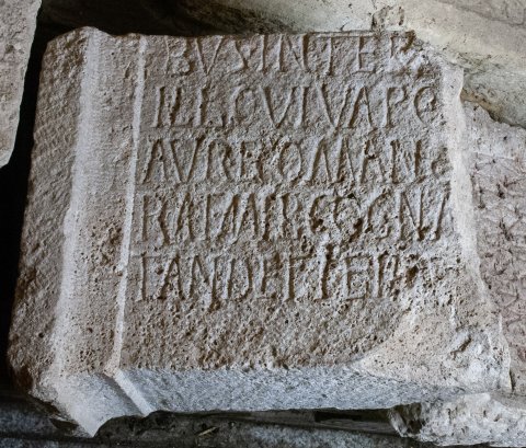 - ---] / [--- a latroni]/bus interfe[cto ---]/illa viva po[suit sibi et] / Aur(elio) Romano [mil(iti) coh(ortis) III] / Bat(avorum) mil(iariae) cogna[to ---] / tande fieri [iussit]