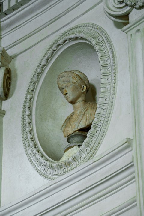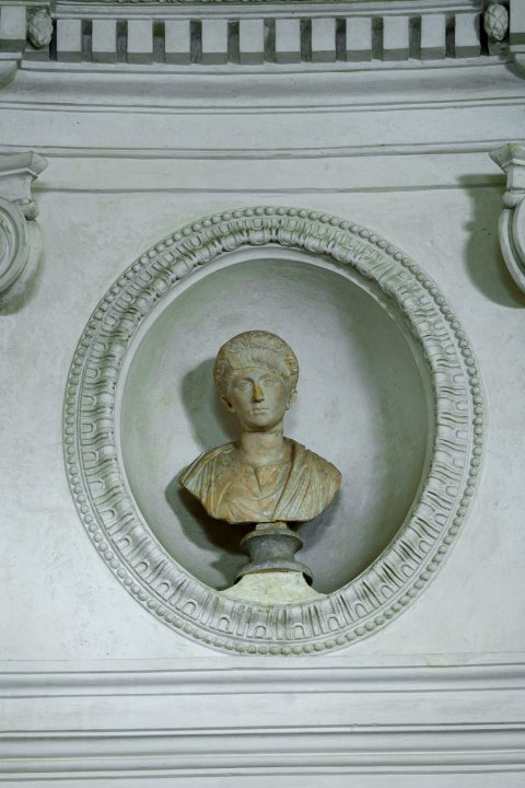 - Porträt einer jungen Frau mit Haarkranz um die Stirn und Haarflechten um den Hinterkopf. Büste mit Mantel über beiden Schultern.