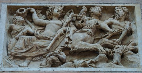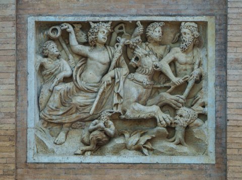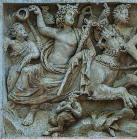 - Mythische Figuren: Thiasos mit Dionysos auf Panther, umgeben von Satyrn, unten kleine Pansfigur mit Syrinx.