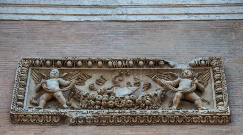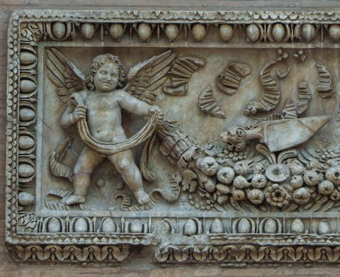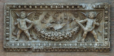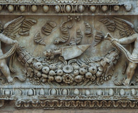 - Von zwei Eroten getragene Fruchtgirlande. Rahmen mit Eierstab, unten Kyma.