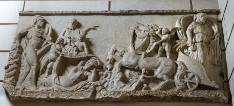 Mythos: links Mars und schlafende Rhea Silvia, von der ein Erot den Mantel wegzieht; oberhalb weiterer Erot und Oberkörper eines bekleideten bärtigen Mannes (Hypnos), der aus einem Horn Mohnsaft über Rhea Silvia ausleert.