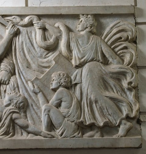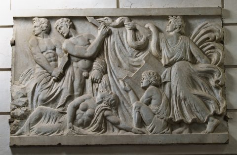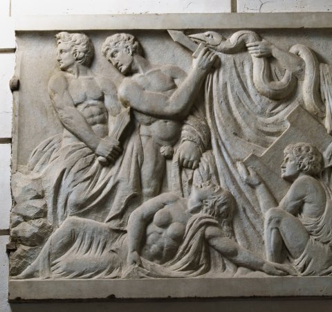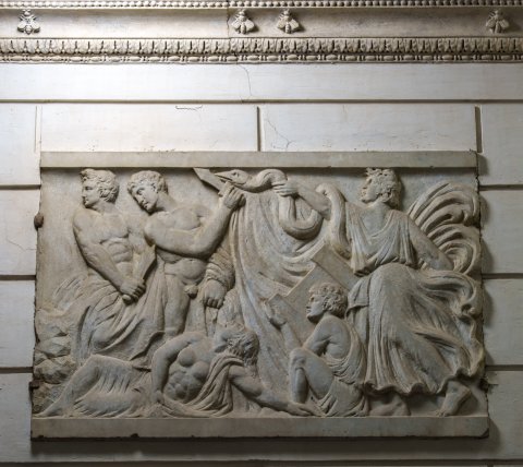 Die Ikonografie des Reliefs folgt in stark vereinfachter Form den Sarkophagreliefs im Vatikan 2513 (CensusID 161445) und 10450 (ASR II 155; Helbig 1127) und im Innenhof des Palazzo Giustiniani (Lupa 35396), zeigt aber nur den Mittelteil mit Orest und Pylades. Eine Anfertigung speziell für die Anbringung als Wandschmuck im Atrio des Palazzo Barberini ist zu vermuten. Der Orestsarkophag Vatikan 2513 war bis ins 18. Jh. im Palazzo Barberini. - Kommentar