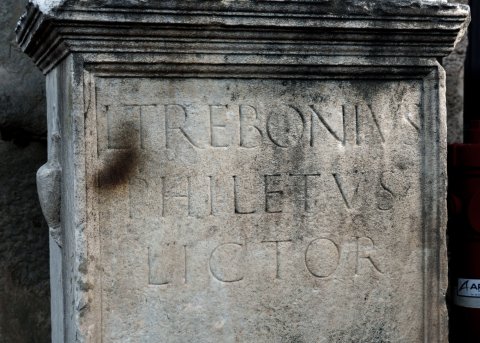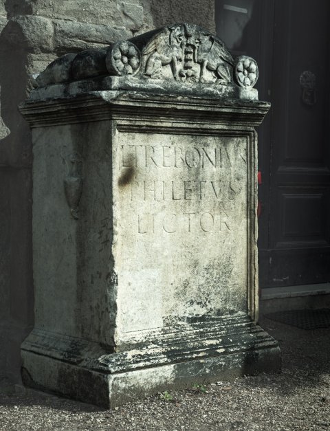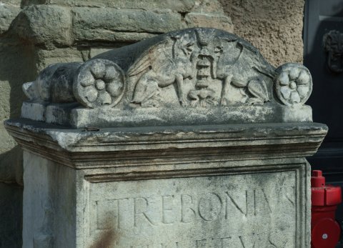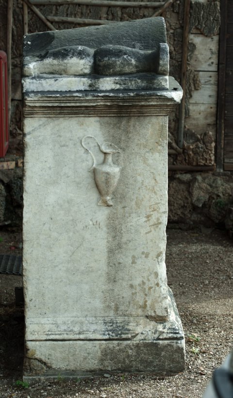 - Halbrunder Aufsatz zwischen geschnürten pulvini mit Rosetten, im Bogenfeld Thymiaterion zwischen Greifen. Auf den Nebenseiten Gefäße (links Kanne, rechts Schale)