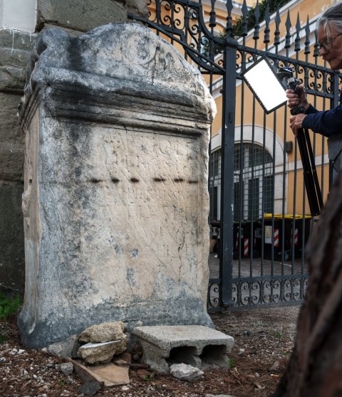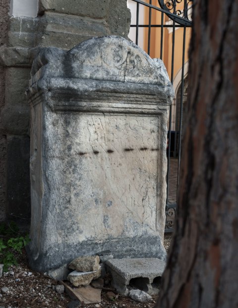 - Halbrunder Aufsatz zwischen geschnürten pulvini mit Rosetten, im Bogenfeld Kranz. Auf den Nebenseiten Gefäße (links Kanne, rechts Schale).