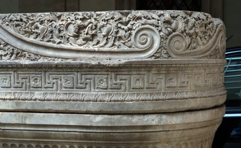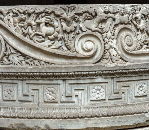 Wannensarkophag mit umlaufenden Riefeln, auf der Vorderseite links Panther-, rechts Pferdeprotome. Dachförmiger Deckel, auf Vorder- und Schmalseiten vorgeblendeter Fries mit Kyma und Mäanderband mit Rosetten, darüber Spiralhaken vor Akanthusranken mit Tieren.