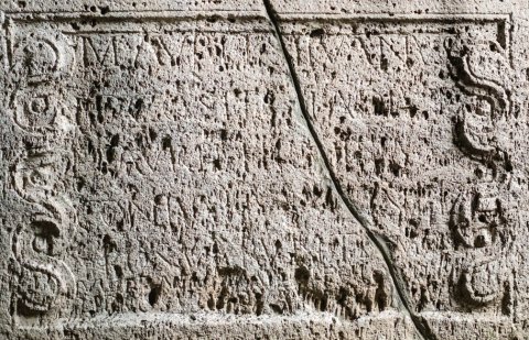 - stark verwittert, Sprung durch die Inschrift