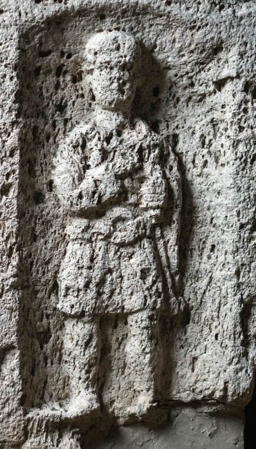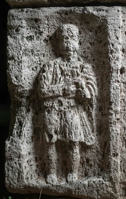 - Dachförmiger Deckel, Eckakroter mit Maske. Sarkophagkasten Vorderseite: Schriftfeld mit geschwungenem Rahmen (sogen. Barockmotiv) zwischen Bogennischen, darin stehender Soldat: kurze Ärmeltunica, Gürtel mit Ringschnalle, Sagum, in der Linken Rolle (volumen). Waffen: an der linken Seite Schwert.