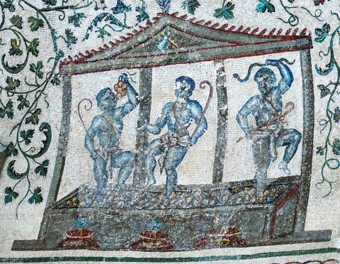 Rechts anschließend jeweils ein Becken mit drei Trauben stampfenden Männern unter einem Giebeldach auf vier Stützen.