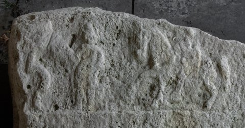 - Zwischenbild mit Totenopfer: dreibeiniger Tisch, rechts Diener. Von rechts Reiter.