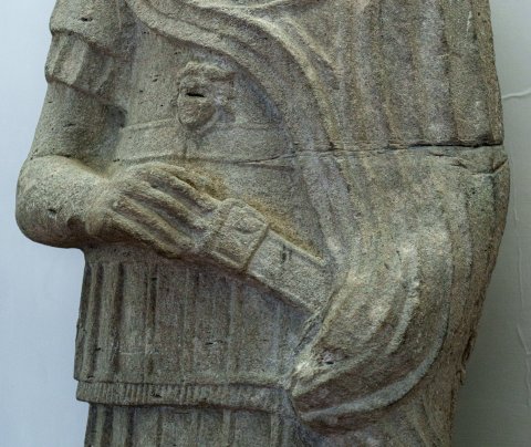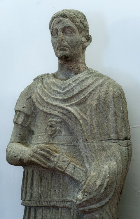 - Stehender bartloser Mann (Soldat, Offizier) in Panzer mit Gorgoneion und Gürtel, Mantel mit Scheibenfibel auf der rechten Schulter. Waffen: Schwert (gladius) an der linken Hüfte, Griff in der rechten Hand.