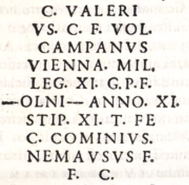 - C(aius) Valeri/us C(ai) f(ilius) Vol(tinia) / Campanus / Vienna mil(es) / leg(ionis) XI G(laudiae)! P(iae) F(idelis) / [|(centuria)] Olni anno[r(um) XX]XI / stip(endiorum) XI t(estamento) f(ieri) e(ussit)! / C(aius) Cominius / Nemausus f(eres)! / f(aciendum) c(uravit)