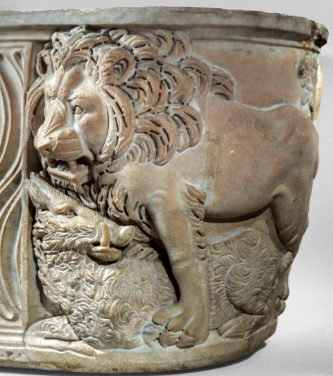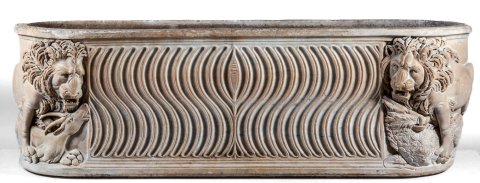 - Wannensarkophag mit Riefeln, auf den Schmalseiten je ein Löwe über Beutetier (Antilope, Bär).