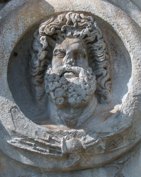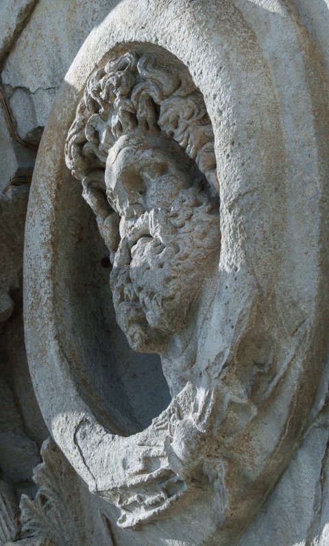 - Mythische Figur: Tondo (Clipeus) mit Büste des Jupiter, auf dem Rahmen des Tondo Blitzbündel.