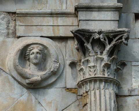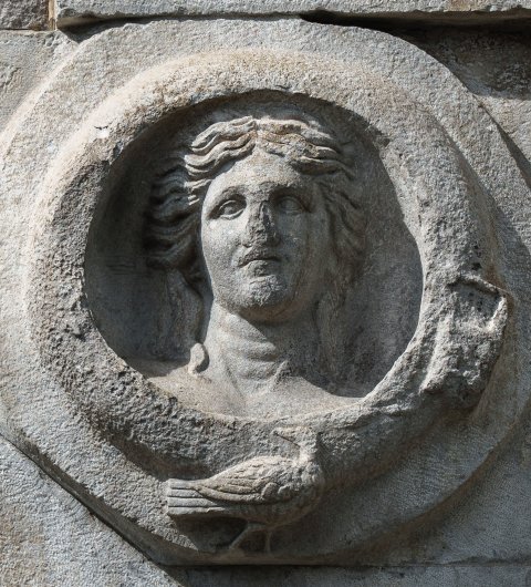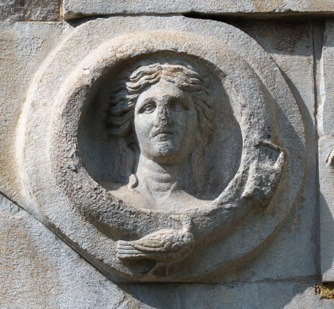 - Mythische Figur: Tondo (Clipeus) mit Büste des Apollo mit Schulterlocken, auf dem Rahmen des Tondo Rabe und Kithara.
