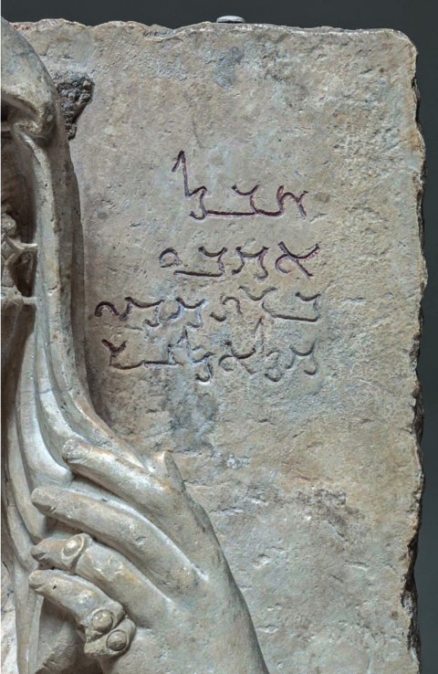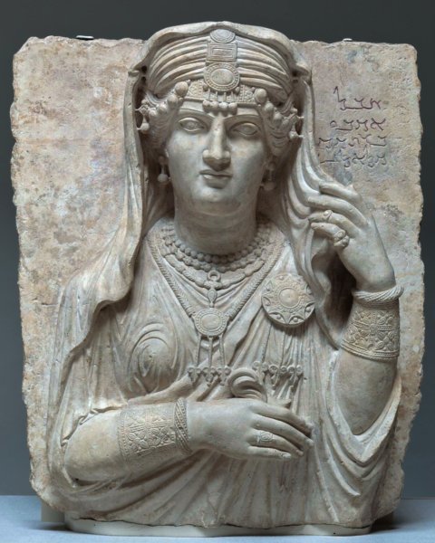 - Rahmenlose Platte mit Hochrelief. Brustbild einer Frau mit turbanartiger Haube und Schleier, Kopf-, Ohr- und Brustschmuck, Armbänder, Fingerringe; Inschrift über der linken Schulter.