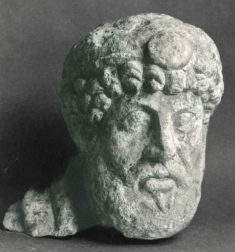 - Porträt eines älteren bärtigen Mannes, im gelockten Haar Binde mit Clipeus über der Stirn, im Nacken Rest des Mantels. Serapispriester ?