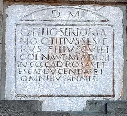 - D(is) M(anibus) / Q(uinto) Titio Sertori/ano Q(uintus) Titius Seve/rus filius qui et / col(legio) naut(arum) m(unicipii) A(triae) dedit / s(estertios) n(ummum) CCCC ad rosas et / escas ducendas ei / omnibus annis