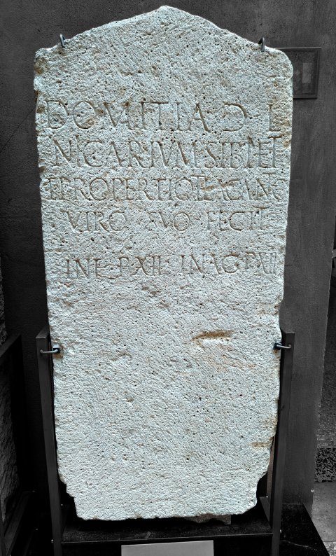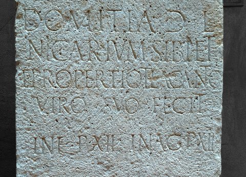 - Domitia |(mulieris) l(iberta) / Nicarium sibi et / T(ito) Propertio T(iti) l(iberto) Acanto / viro suo fecit / in f(ronte) p(edes) XII in a(gro) p(edes) XII