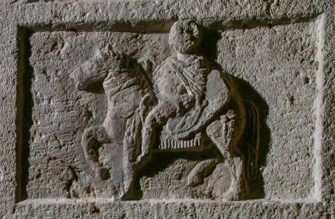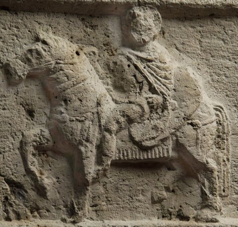 - Im Giebel Rosette. Im Hauptbild Reiter (Soldat) in Tunica, Sagum, Waffen: Schwert (?), Ovalschild mit Schildbuckel. Satteldecke mit Fransen.