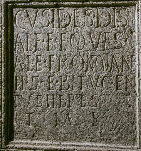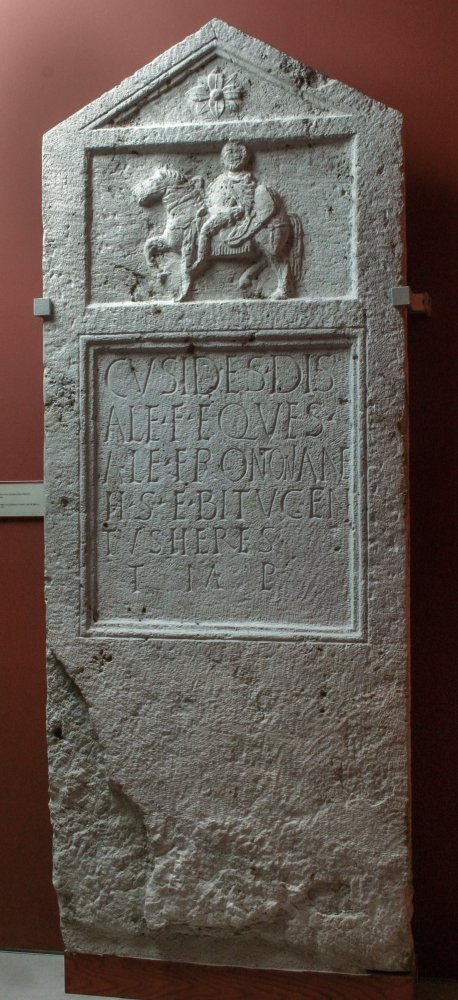 - Cusides Dis/al(a)e f(ilius) eques / al(a)e Frontonian(a)e / h(ic) s(itus) e(st) Bitugen/tus heres / t(itulum) m(emoriae) p(osuit)