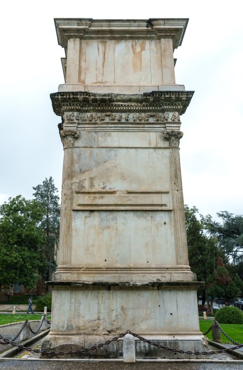 - Eintoriger Ehrenbogen mit gleich lautenden Inschriften auf beiden Seiten der Attika, flankiert von Reliefs. Darunter umlaufender Fries, seitlich des Durchgang je vier Relieffelder, darüber und dazwischen Friese, Im Durchgang je ein großes Relieffeld, in der Tonnenwölbung Kassettendecke, im Zentrum quadratisches Relief mit Kaiser und Victoria.