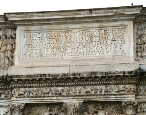 - Imp(eratori) Caesari divi Nervae filio / Nervae Traiano optimo Aug(usto) / Germanico Dacico pontif(ici) max(imo) trib(unicia) / potest(ate) XVIII imp(eratori) VII co(n)s(uli) VI p(atri) p(atriae) / fortissimo principi senatus p(opulus)q(ue) R(omanus)
