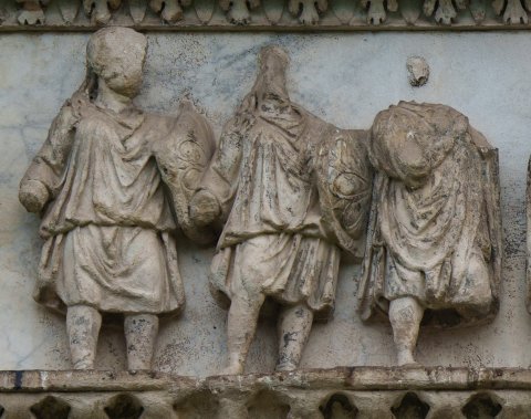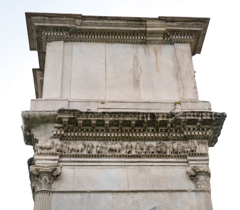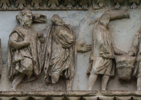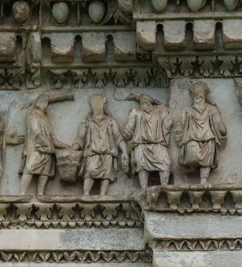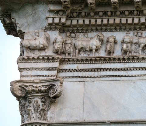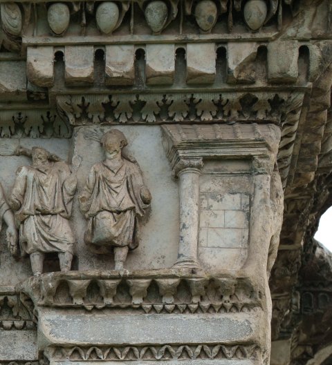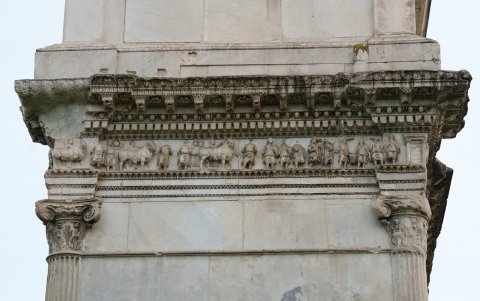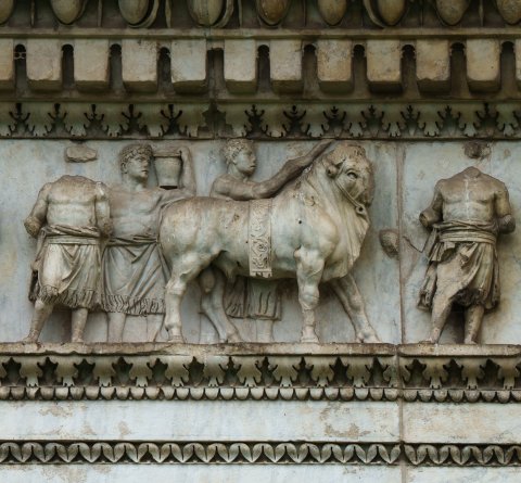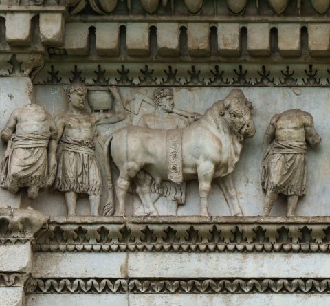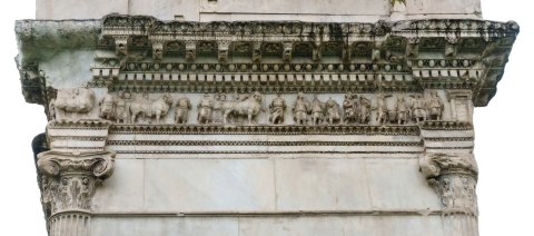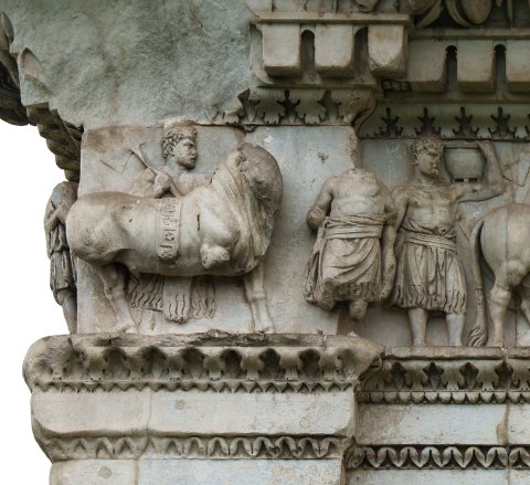 - Anfang des in einer Richtung um den Bogen laufenden Frieses mit Opfertieren (Stiere) und Opferdienern, die sich auf eine Tempelarchitektur zu bewegen. Darüber Konsolgesims, unterhalb Fascienarchitrav.