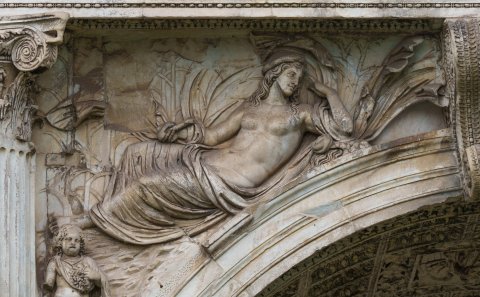 Zu den Seiten des Schlusssteins links gelagerte weibliche Ortsgottheit (Quellnymphe ?) mit Haube und Mantel um Hüften und Beine, velum hinter dem Oberkörper; unter dem linken Arm entspringendes Wasse. Attribut in der rechten Hand ? Im Hintergrund Schilfstängel. Unter den Füßen der Gelagerten stehende kindliche Personifikation einer Jahreszeit (Herbst mit Trauben im Mantelbausch).