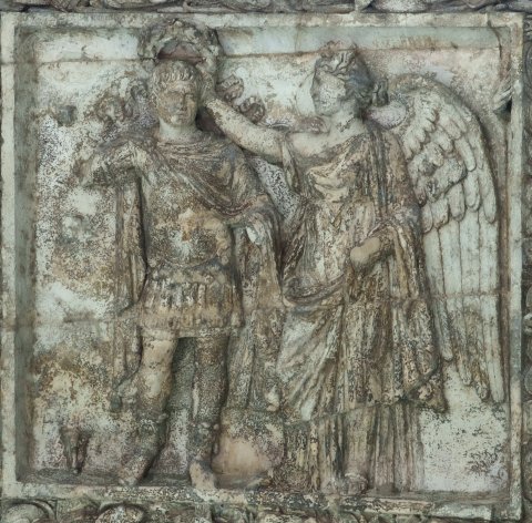 Tonnengewölbe mit Kassettendecke; quadratische Kassetten mit Kyma und Eierstab gerahmt, in der Mitte Rosetten. Im Bogenscheitel quadratisches Bildfeld, darin Trajan von Victoria bekränzt; auf dem Rahmen Waffen.