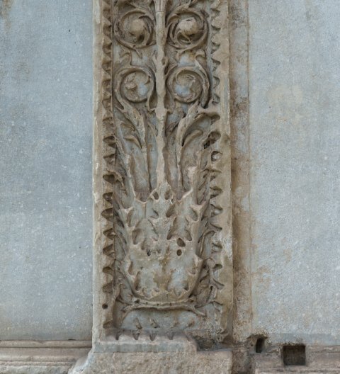 Auf den seitlichen, bis zum Sockelprofil durchgehenden Rahmenleisten Akanthuskelch, aus dem Spiralranken wachsen; oben stehender Adler.