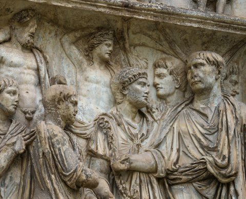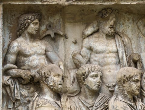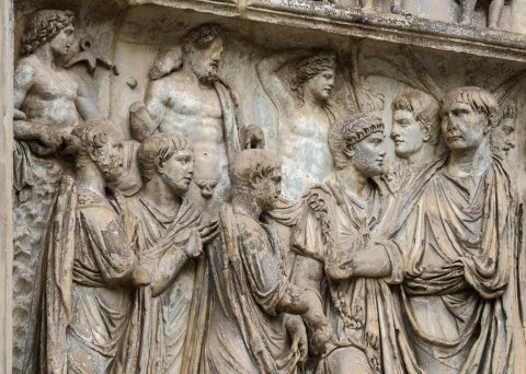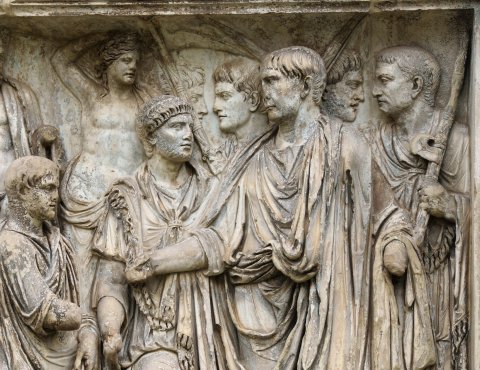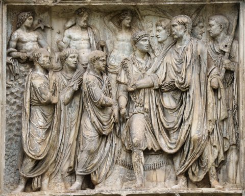 - Rechts steht Kaiser Trajan in Toga, beleitet von Lictoren und Offizier im Mantel mit Fransensaum. Von links treten drei Togati auf ihn zu; im Hintergrund oben gelagerte jugendliche Gottheit mit Anker (Personifikation einer Hafenstadt), Hercules und Apollo.