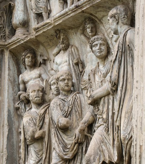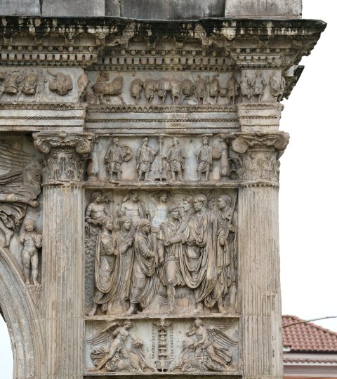 35615 Trajansbogen von Benevent: Bürger einer Stadt vor dem Kaiser (Stadtseite rechts oben)