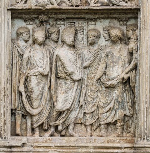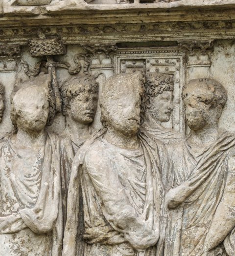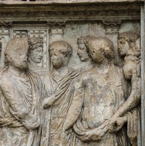 - Adventus: Kaiser Trajan mit Genius senatus und Genius populi romani, Vertreter der römischen Bürger in Italien und den Provinzen sowie Volk vor der Curia Julia am Forum Romanum.