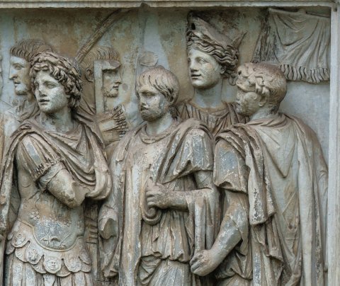- Links Kaiser Trajan in kurzer Tunica und Mantel, begleitet von Lictoren, in der Mitte jugendlicher Genius in Brustpanzer, der dem Kaiser einen Rekruten präsentiert.