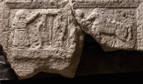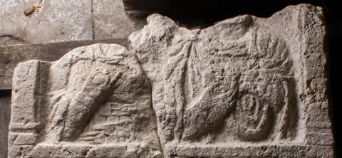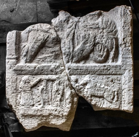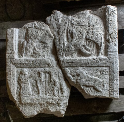 - Im Hauptbild Ehepaar: zwischen Pilastern zwei Brustbilder. Links einheimische Frau mit Fibeln, Torques, Armbänder, Gürtelschnalle, in der Rechten Frucht. Rechts Mann im Sagum mit Scheibenfibel, in der Rechten Becher ? Zwischenbild mit Totenopfer, Calo: dreibeiniger Tisch, links Dienerin, rechts Calo, der ein gesatteltes Pferd am Zügel hält.