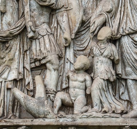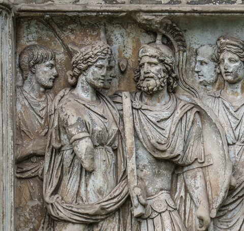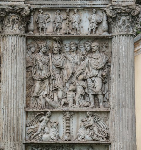 - Rechts Kaiser Trajan in kurzer Tunica und Mantel, vor ihm zwei Kinder (Mädchen und kniender nackter Knabe), Mars und Göttin mit Pflug; im Hintergrund zwei weitere Göttinnnen und Lictoren.