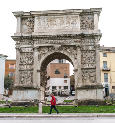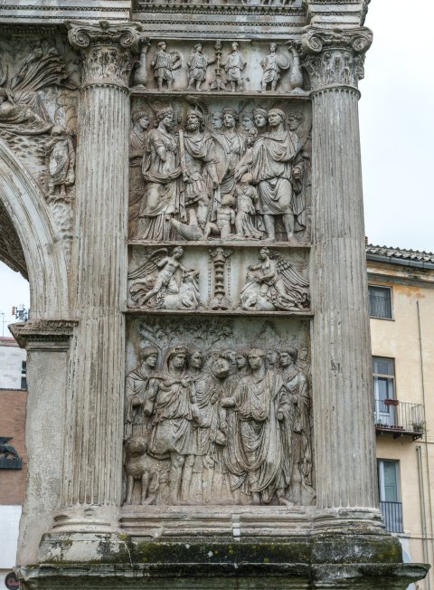 - K. Fittschen, Das Bildprogramm des Trajansbogens zu Benevent, Archäologischer Anzeiger 1972, 742–788; E. Simon, Die Götter am Trajansbogen zu Benevent (Trierer Winckelmannsprogramm 1–2). Zabern, Mainz 1981