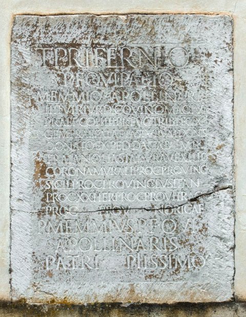 - T(ito) Prifernio / P(ubli) f(ilio) Qui(rina) Paeto / Memmio Apollinari / IIIIvir(o) iur(e) dic(undo) quinq(uennali) mag(istro) iu(venum) / praef(ecto) coh(ortis) III Breuc(orum) trib(uno) leg(ionis) X / Gem(inae) praef(ecto) alae I Asturum donis / donato exped(itione) Dac(ica) ab Imp(eratore) / Traiano hasta pura vexillo / corona murali proc(uratori) provinc(iae) / Sicil(iae) proc(uratori) provinc(iae) Lusitan(iae) / proc(uratori) XX(vicesimae) her(editatium) proc(uratori) prov(inciae) Thrac(iae) proc(uratori) prov(inciae) Noric<i=AE>ae / P(ublius) Memmius P(ubli) f(ilius) Qui(rina) / Apollinaris / patri pi(i)ssimo