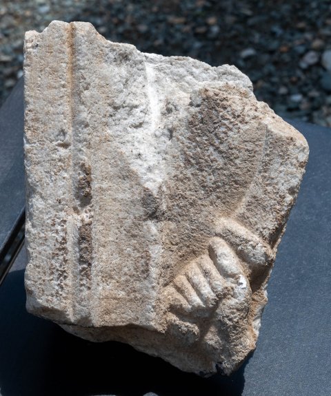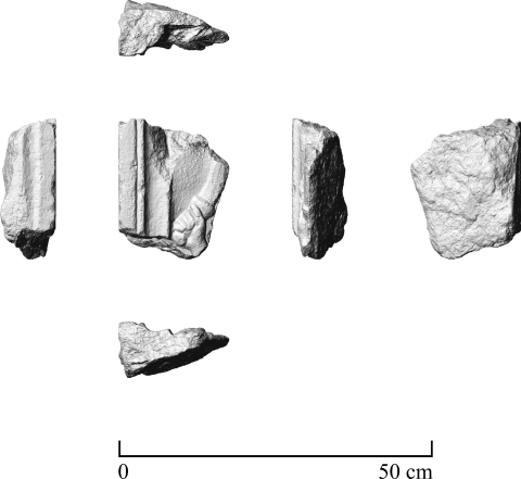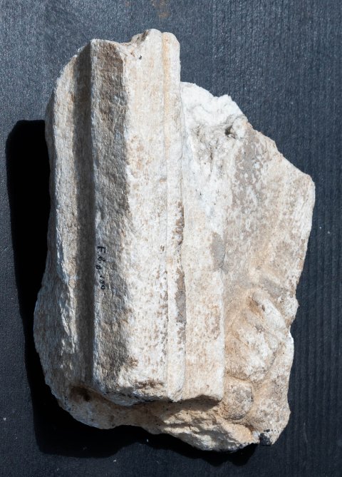 - Stück der Kante eines Eckblocks bzw. Schafts erhalten, beide Seiten gerahmt, eine Seite (die Nebenseite?) mit einfacherem profiliertem Rahmen